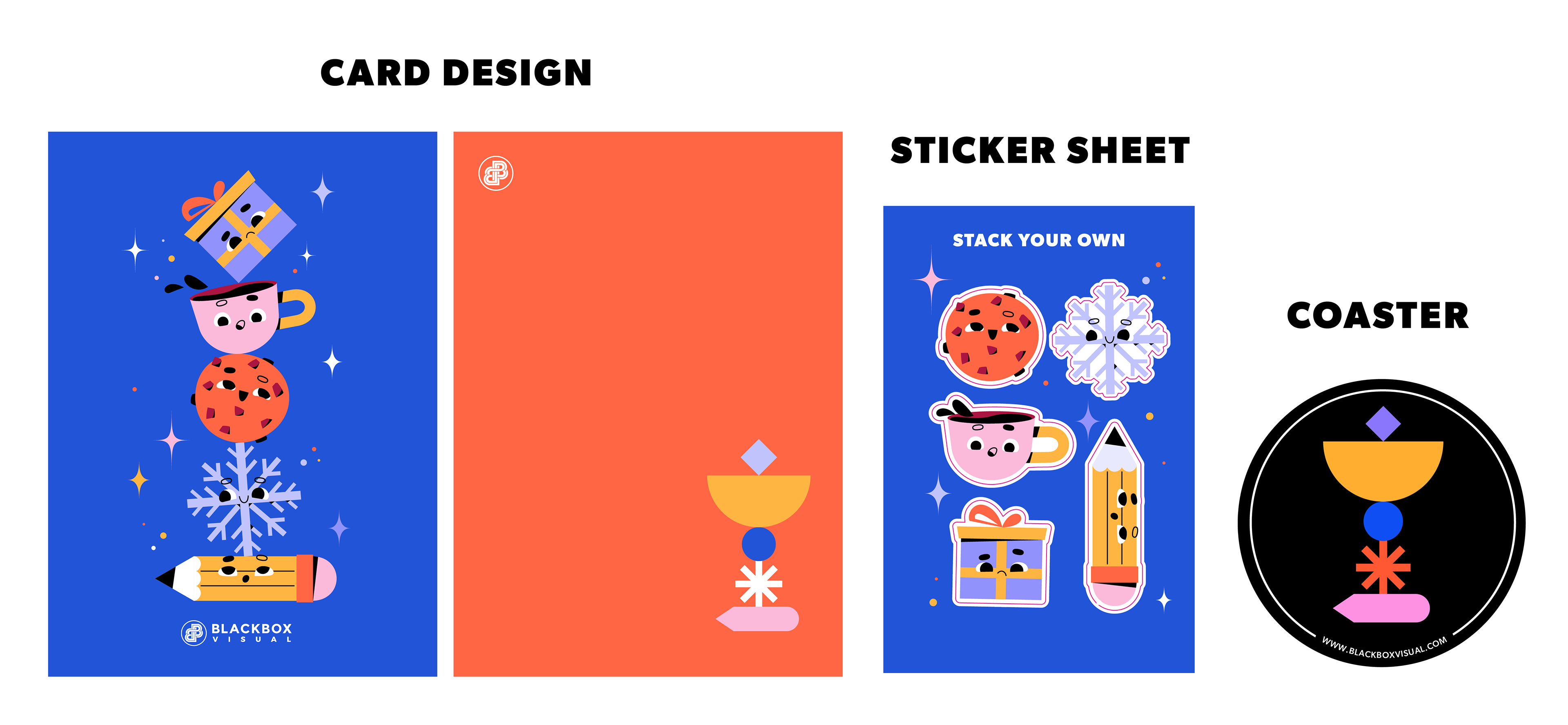 For this project we decided to pair a character based design and a contemporary composition. We created a custom card, sticker sheet and a coaster that our clients can keep and use for a long time.